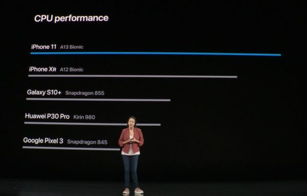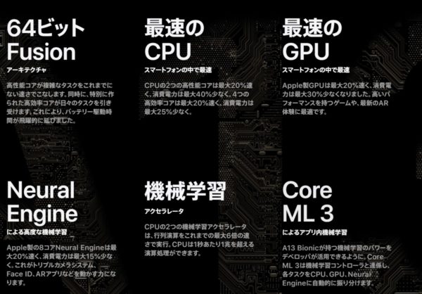 プロセッサはiPhone 11 / Pro / Pro Max ともに「A13 Bionic」を搭載。前モデルA12比較で最大20%高速化されています。当然のことながら、SnapdragonやKirinよりも高性能です。