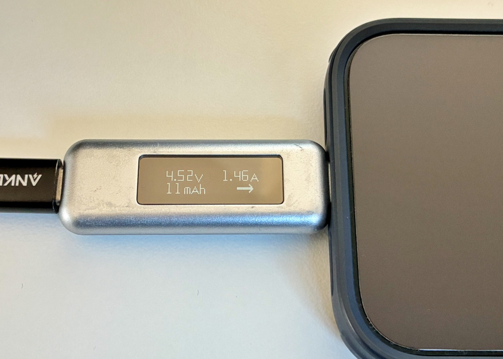 USB-C接続時で4.52V × 1.46A = 6.59Wでの充電となり、USB-A接続時の0.9Aよりも約1.5倍早く充電が可能となります。