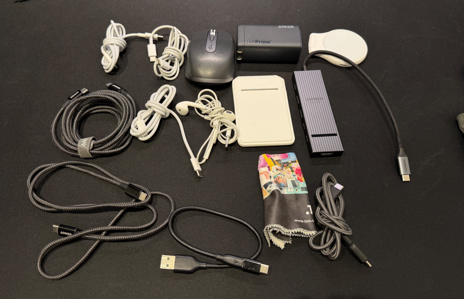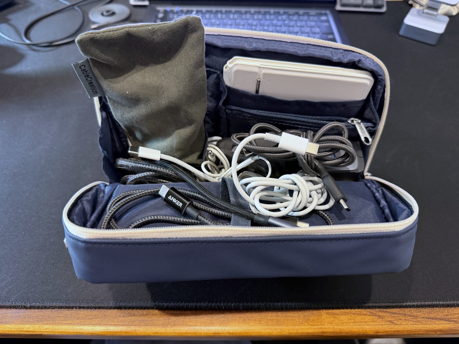 ジャストサイズな収納:Anker製の充電器、モバイルバッテリー、ケーブルが驚くほど綺麗に収まります。
