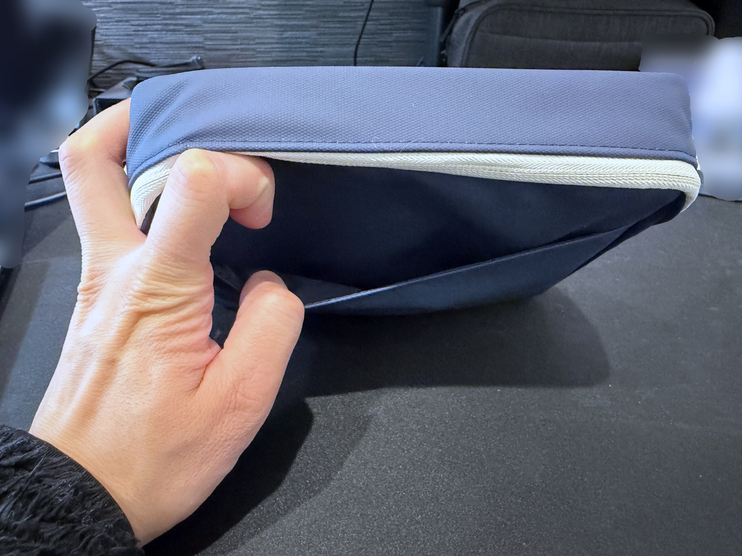 厚みはわずか5cm。非常にスリムなのでカバンの中で場所を取りませんが、デスクの上で自立するのが地味に嬉しいポイント。フリーアドレスやカフェでの作業中も、省スペースでスマートに使えます。