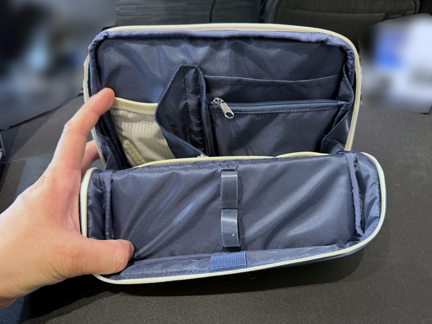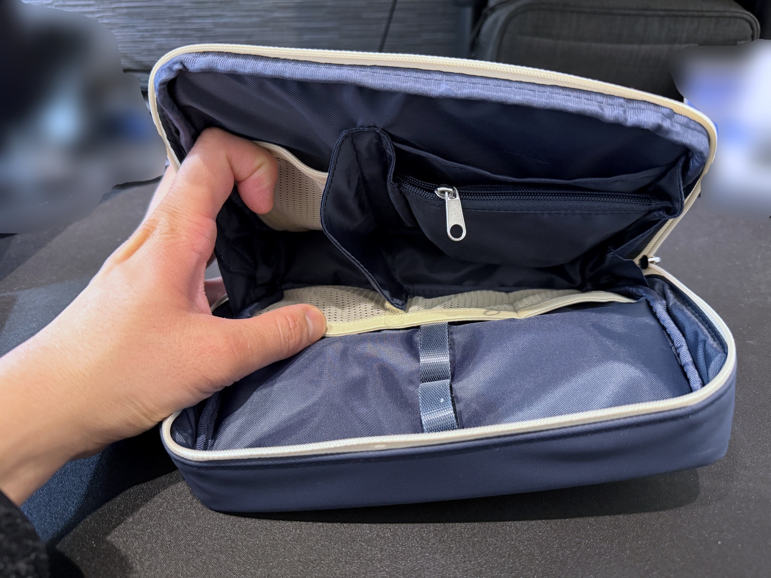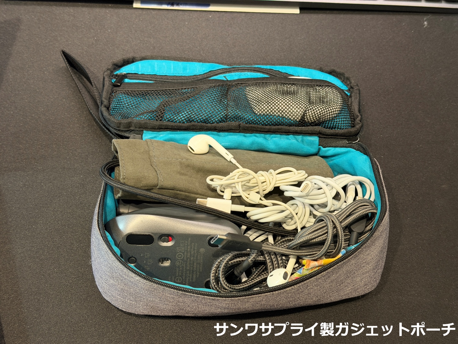 ちなみに写真に写っているガジェットを全て収納しています。充電器、マウス、USBハブも収納しており、この3点だけでもかなりの面積を使っています。それでも程よいサイズ感で内ポケットの部屋分けがされているので無理やり詰めることなく収納できています。