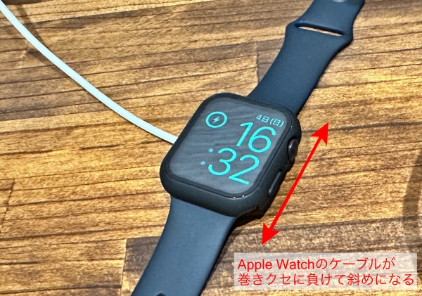 また、Apple Watch充電中に関しては時計のバンドで机の上の面積を取るだけではなく、ケーブルのクセで斜めになる始末。。。